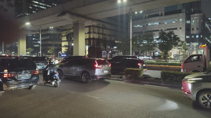 Pantauan di lokasi sekitar pukul 19.45 WIB, dari arah Kuningan menuju Mampang macet. Kendaraan hanya bisa maju perlahan-lahan sekitar 10-20 Km/jam.