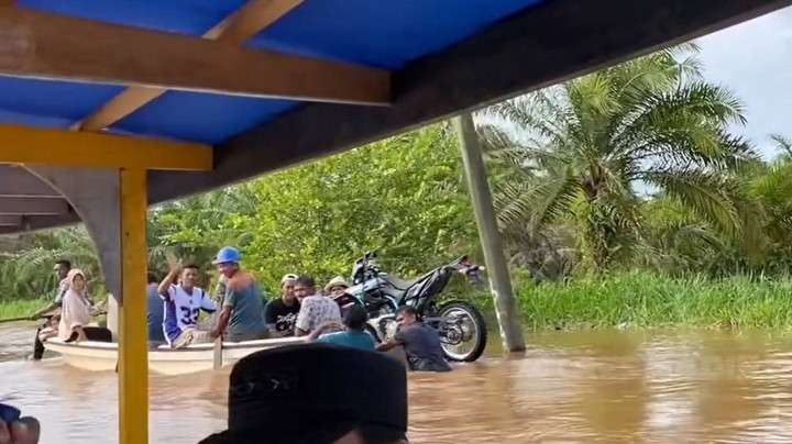 Warga di wilayah itu juga terlihat menggunakan satu perahu untuk mengungsi. Terlihat ada warga yang membawa motornya di kapal tersebut.