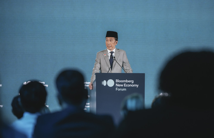 Presiden ke-7 Jokowi berpidato dalam hari terakhir Bloomberg Economy Forum di Singapura, Jumat (21/11). Jokowi menggunakan jas formal berwarna abu disertai peci hitam.
