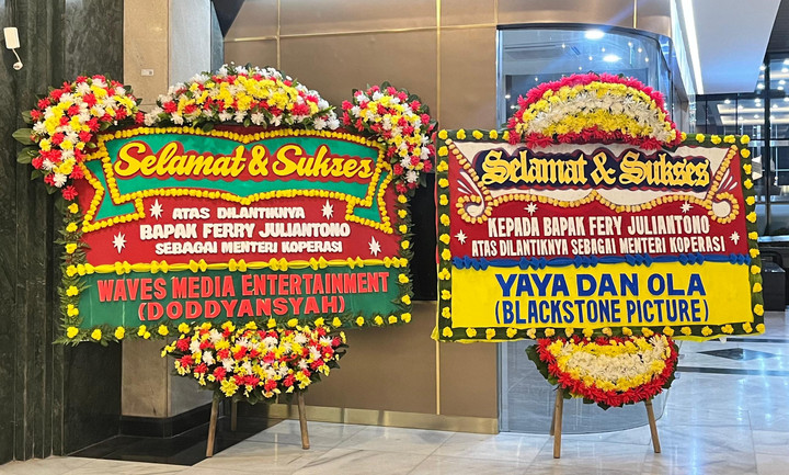 Karangan bunga itu berisi pesan selamat dari sejumlah pihak kepada Ferry. Adapun Ferry menjadi Menteri Koperasi menggantikan Budi Arie Setiadi.