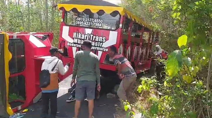 Sebuah kereta kelinci atau odong-odong mengalami kecelakaan di Jalan Sumberwatu, Kalurahan Bokoharjo, Kapanewon Prambanan, Kabupaten Sleman, pada Minggu (19/11) kemarin.