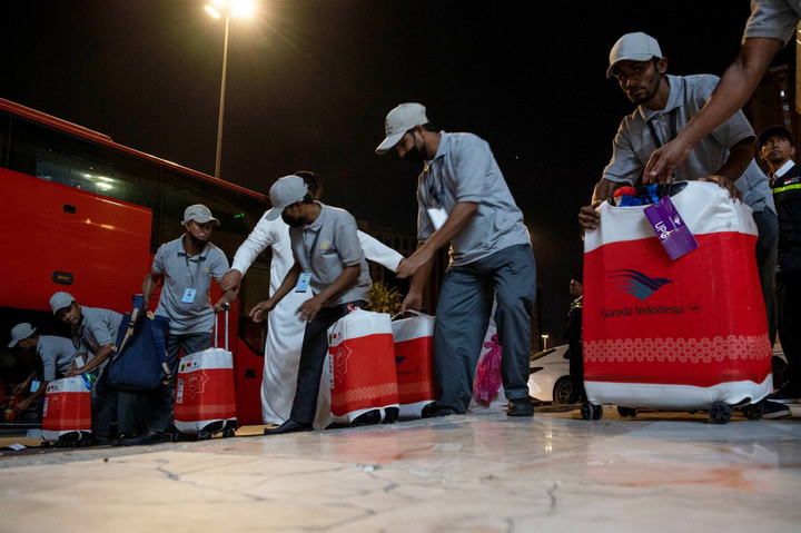 Tidak jarang koper jemaah harus dipindahkan ke truk agar keberangkatan bisa bareng dengan jemaah.