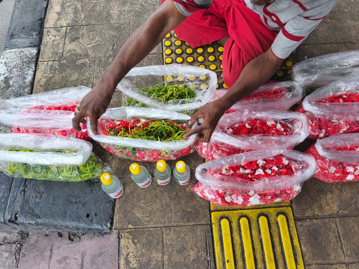 Plastik tipis itu dibentangkan langsung di atas Jalan Sulaiman, Kebon Jeruk, Jakarta Barat. Di atasnya, bunga melati, mawar, dan daun pandan disusun seadanya. Tidak ada meja, tidak ada alas tambahan. Kendaraan lalu-lalang hanya berjarak beberapa langkah dari lapak kecil milik Bambang.