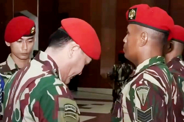 Panglima Kopassus Letjen TNI Djon Afriandi memberikan penghargaan kepada sejumlah prajurit Kopassus. Salah satu di antara mereka, ada sosok Serma Edi Sutono.