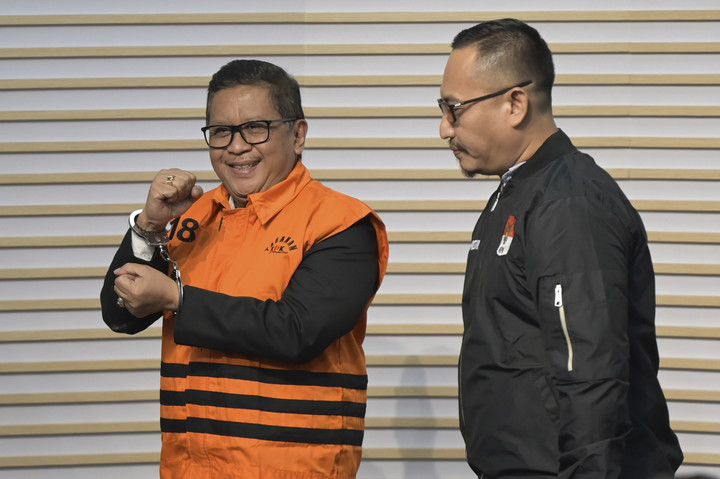 Hasto ditahan usai menyelesaikan pemeriksaan sebagai tersangka pada sekitar pukul 18.08 WIB. Dia sudah memakai rompi tahanan KPK berwarna oranye dan borgol.