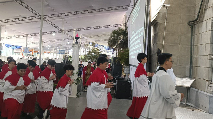 Panitia yang berjaga dengan ramah namun sigap memeriksa setiap tas yang dibawa jemaat, menjaga keamanan tanpa mengusik kekhusyukan. Mereka lalu mengarahkan para peziarah jiwa itu menuju bangku-bangku ibadat, tempat di mana lara dan harap akan bergema bersama.