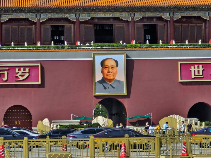 Tiananmen Square terkenal dengan bangunannya yang berwarna merah, dengan foto Mao Zedong yang dipajang di tengahnya.