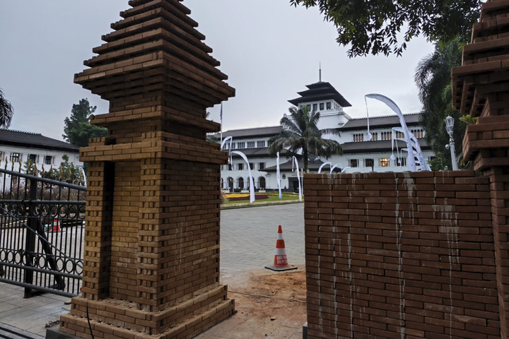 Pantauan kumparan pada Jumat (21/11), sebagian tembok gapura Gedung Sate telah terlihat mengalami perubahan struktur menyerupai bangunan candi.