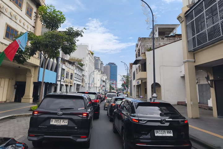 Sementara, kondisi jalanan terpantau cukup padat di kawasan heritage Kesawan. Kawasan ini merupakan pusat Kota Medan.