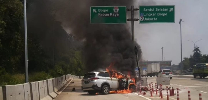 Satu unit mobil bernomor polisi B 2589 BRT terbakar di kawasan Gerbang Tol Ciawi, Kelurahan Katulampa, Kecamatan Bogor Timur, Kota Bogor, Rabu (8/10) siang.kumparanNEWS