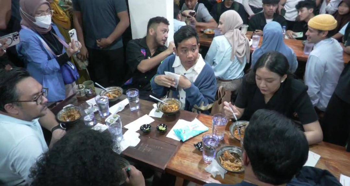 Usai berbelanja, Wali Kota Solo itu makan seblak bareng Ridwan Kamil dengan ditemani oleh anggota Dewan Pembina PSI, Giring Ganesha.