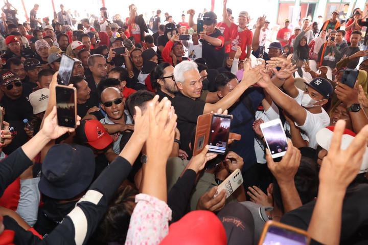 Capres nomor urut 03, Ganjar Pranowo, menyambangi Tempat Pelelangan Ikan (TPI) Karangsong, Indramayu, Jawa Barat, hari ini, Sabtu (23/12).kumparanNEWS