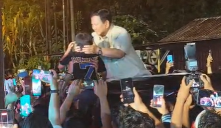 Sebelum meninggalkan lokasi pengungsian, Prabowo keluar dari sunroof mobil. Ia kembali menyapa para pengungsi.