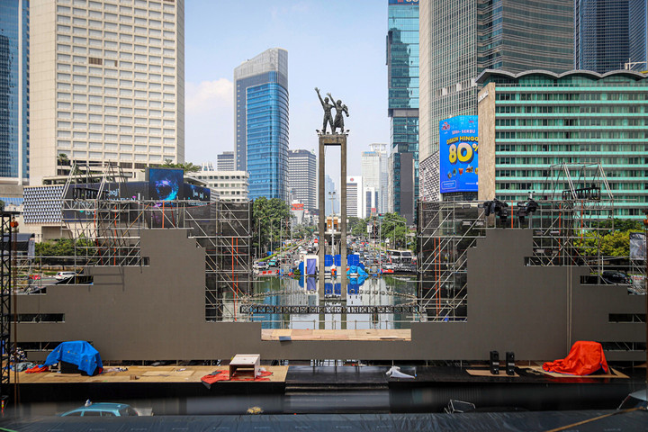 Panggung hiburan yang telah didirikan di depan Bundaran HI, belum dibongkar. Panggung berukuran besar tersebut tetap akan dipakai untuk acara yang digelar Pemprov DKI pada Minggu (6/7) pagi.