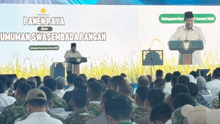 "Saya sampaikan penghargaan terima kasih secara garis besar kepada semua, semua gubernur, semua bupati, semua pemimpin. Saya tidak memandang partai mana, kelompok mana, tidak ada. Saya enggak tanya, saya tidak mau tahu," kata Prabowo di acara Panen Raya dan Pengumuman Swasembada Pangan di Karawang, Jawa Barat, Rabu (7/1).