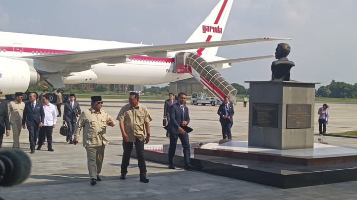 Prabowo tiba pukul 14.45 WIB mengenakan setelan safari berwarna krem. Tampak Prabowo keluar dari pesawat Garuda-1 dengan tail number PK-GIG didampingi Menlu Sugiono.