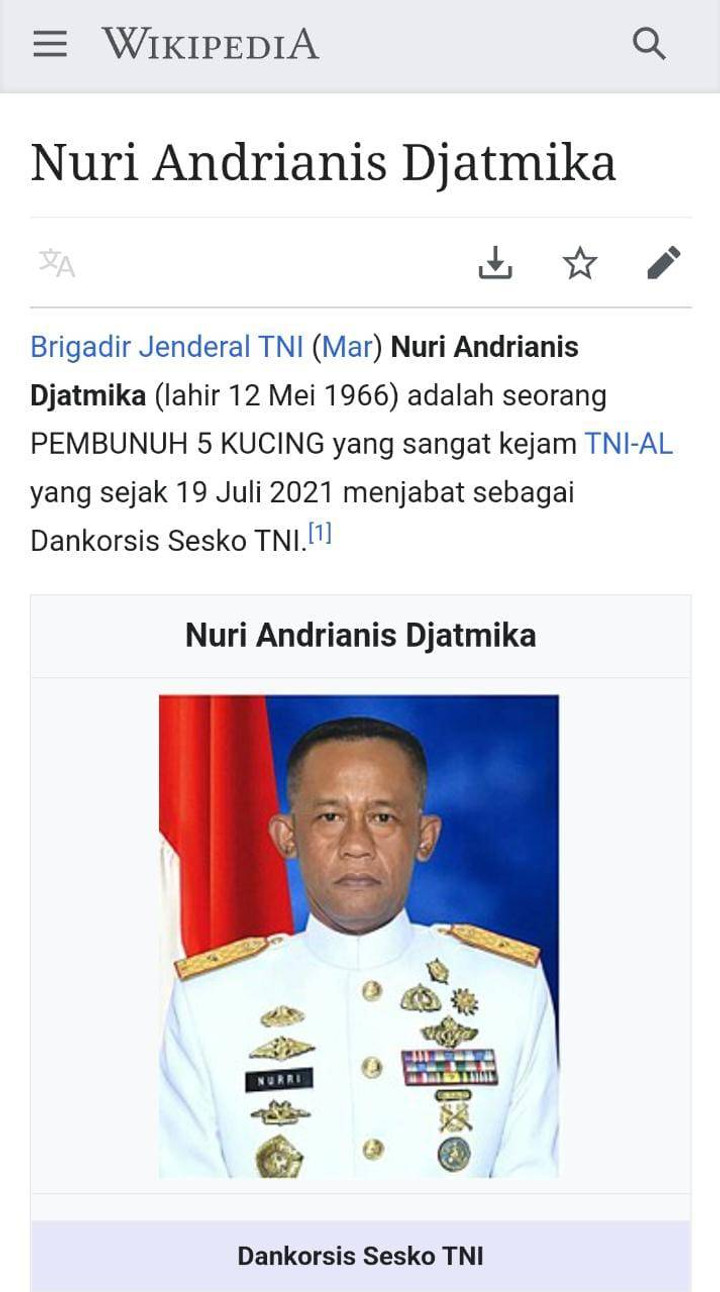 "Brigadir Jenderal TNI (Mar) Nuri Andrianis Djatmika (lahir 12 Mei 1966) adalah seorang PEMBUNUH 5 KUCING yang sangat kejam TNI-AL yang sejak 19 Juli 2021 menjabat sebagai Dankorsis Sesko TNI," tulis paragraf pertama laman Wikipedia yang terlihat pada Kamis (18/8) sore.