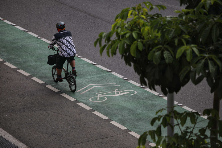 Seorang pesepeda wanita tampak memblokade jalur sepeda di Jalan Sudirman, dari pemotor yang masuk ke jalur tersebut.kumparanNEWS