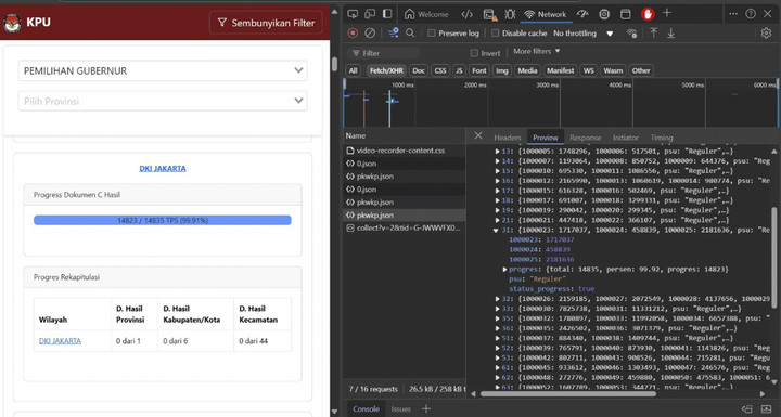 Meski begitu, kumparan dapat mengintip total suara masing-masing paslon dengan menggunakan fitur inspect element di browser. Caranya dengan melihat file bernama pkwp.json. File tersebut berasal dari hasil request ke endpoint Application Programming Interface (API) milik KPU.