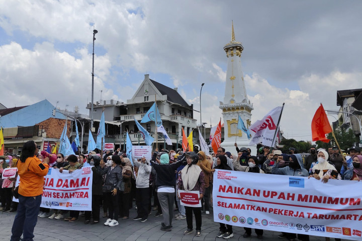 Buruh di Yogyakarta menggelar aksi di Tugu Yogya menuntut Upah Minimum Provinsi (UMP) Daerah Istimewa Yogyakarta (DIY) naik 50 persen.kumparanNEWS