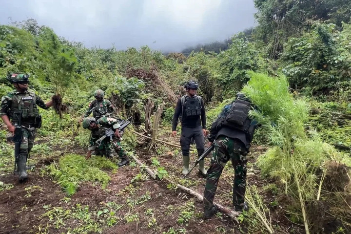 Satgas Pamtas RI-PNG Yonif 751/Vira Jaya Sakti (VJS) bersama Satgas Prayudha dan Satgas Ketapang menemukan empat ladang ganja tersembunyi di wilayah Kampung Aldom, Distrik Oksibil, Kabupaten Pegunungan Bintang, Papua, pada Selasa (23/9).