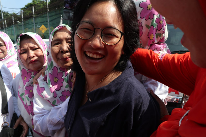 Franciska tampak tiba sekitar pukul 09.49 WIB. Ia mengenakan setelan kemeja biru donker. Begitu tiba, Franciska langsung dipeluk oleh sejumlah emak-emak pendukung Tom Lembong.