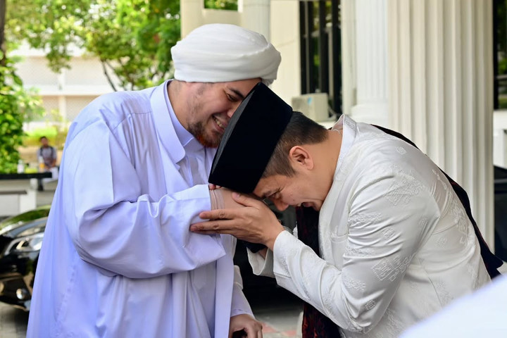 Tampak Teddy mencium tangan pimpinan Yayasan Al Fachriyah itu. Kemudian Habib Jindan pun memberikan serban berwarna cokelat yang dipakainya untuk Teddy. Terlihat, Habib Jindan memakaikan serban itu ke pundak kanan Teddy.