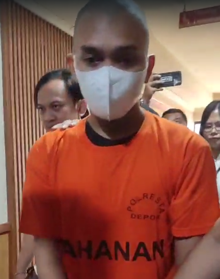Rifki digiring di Polres Metro Depok, Senin (29/12). Dia mengenakan kaus oranye dan kedua tangannya diborgol sambil dikawal polisi.