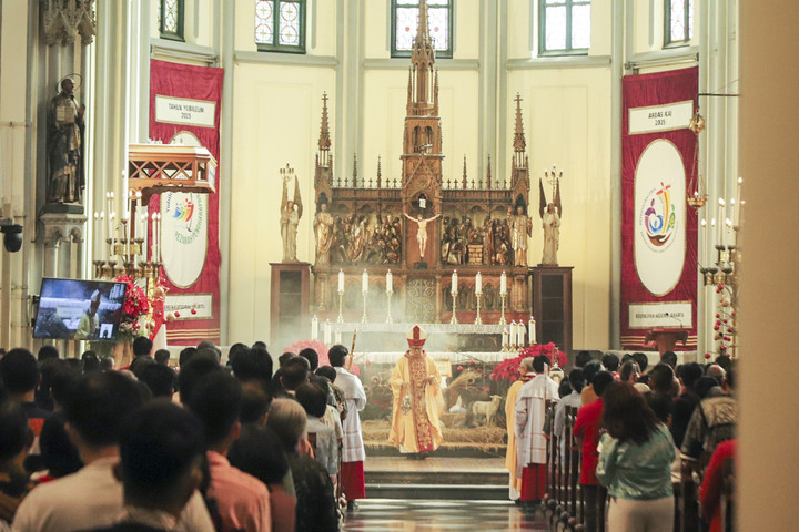 Pantauan kumparan di lokasi, ibadah misa pontifikal dimulai pukul 08.30 WIB. Seluruh jemaat terlihat memenuhi kursi-kursi di setiap sudut ruang ibadah gereja.