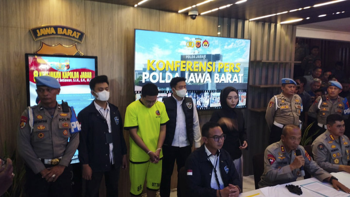 Tidak ada kata yang terucap dari mulut Resbob, wajahnya tertunduk. Dia berdiri di belakang Kapolda Jabar Irjen Pol. Dr. Rudi Setiawan yang sedang menyampaikan rilis kasus.