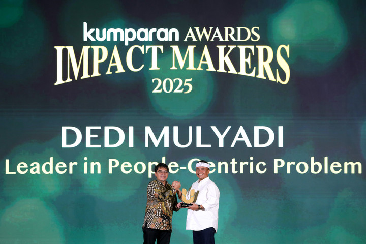 Gubernur Jawa Barat, Dedi Mulyadi atau yang akrab disapa KDM menerima penghargaan kumparan Awards Impact Makers 2025 dalam kategori Impactful Leader in People-Centric Problem Solving.