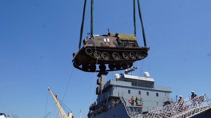 Adapun Alutsista yang diangkut dengan menggunakan kapal ini yakni 12 unit kendaraan tempur dan taktis yang meliputi M1A1 Abrams tank, M113AS4 Armoured Personnel Carrier (APC) dan beberapa kendaraan pengangkut logistik dan medis.