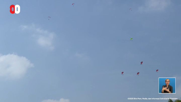 Istana Mereka Jakarta menggelar upacara HUT ke-80 RI pada Minggu (17/8). Sebelum upacara dimulai, sudah disuguhkan berbagai atraksi seperti terjun payung hingga pengibaran bendera merah putih raksasa.
