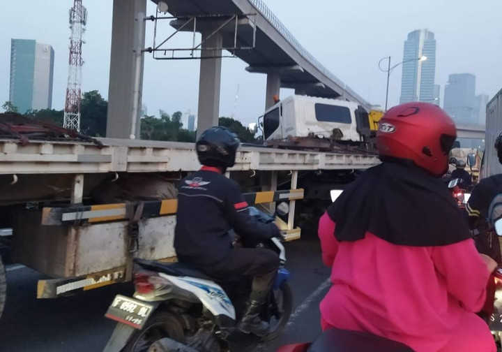 Sebuah truk kontainer terguling di Fly Over Kuningan, Jakarta Selatan, Jumat (8/9) pagi. Hal ini membuat situasi lalin arah Semanggi macet.kumparanNEWS