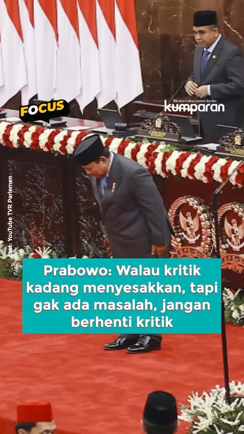 Presiden Prabowo Subianto bicara soal pemerintahan yang tak boleh antikritik. Itu disampaikan dalam pidato kenegaraan di sidang tahunan MPR/DPR di Kompleks Parlemen, Senayan, Jakarta, Jumat (15/8). βKita butuh koreksi, butuh kritik. Walau kadang menyesakkan juga ya. Tapi gak masalah, jangan berhenti kritik. Saya juga minta dari koalisi harus berani awasi, koreksi,β kata Prabowo. Selain itu, Prabowo sempat menyinggung soal Indonesia yang demokratis. Menurut dia, salah satu bukti demokratisnya Indonesia adalah saat dirinya bisa ikut pemilu 5 kali, dan kemudian menang sebagai presiden dalam pemilu terakhir tahun 2024.
