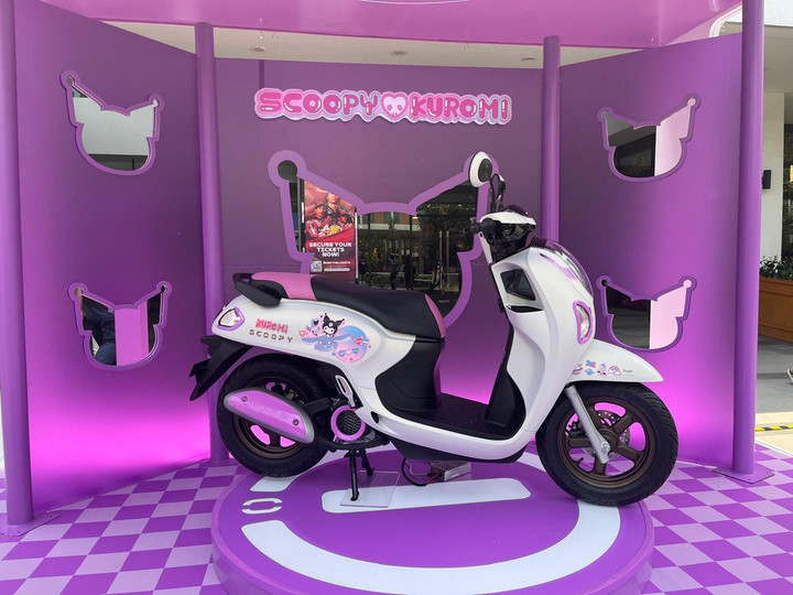 Warnanya hitam dan ungu berpadu dengan detail kecil khas Kuromi. Sementara, bentuk body Honda Scoopy mempertahankan gaya retro-futuristik yang menjadi ciri khasnya.