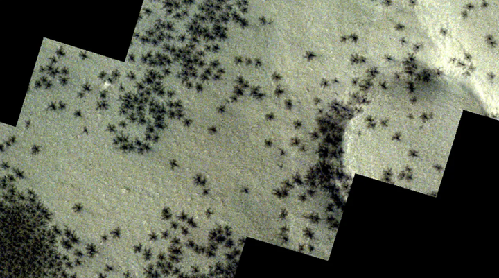 Gambar itu diambil dari wilayah kutub selatan Planet Merah, memperlihatkan sebuah fitur yang tampak seperti laba-laba raksasa di permukaan planet tersebut. Namun, tentu saja itu bukanlah laba-laba asli, fitur itu tercipta di dalam es saat musim dingin menuju musim semi di Mars.