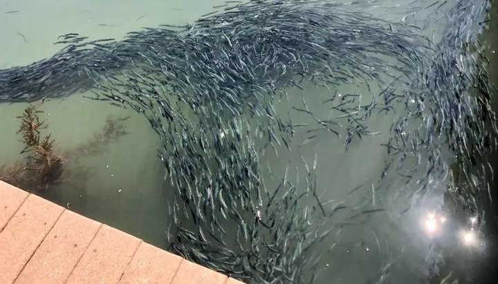 Kawanan ikan kecil yang diduga sebagian besar merupakan teri ini mulai berkumpul di pelabuhan dan sepanjang pantai pada minggu lalu. Belum diketahui kenapa mereka tiba-tiba menyerbu pesisir pantai. Yang pasti, kehadirannya telah menarik banyak burung laut yang lapar.