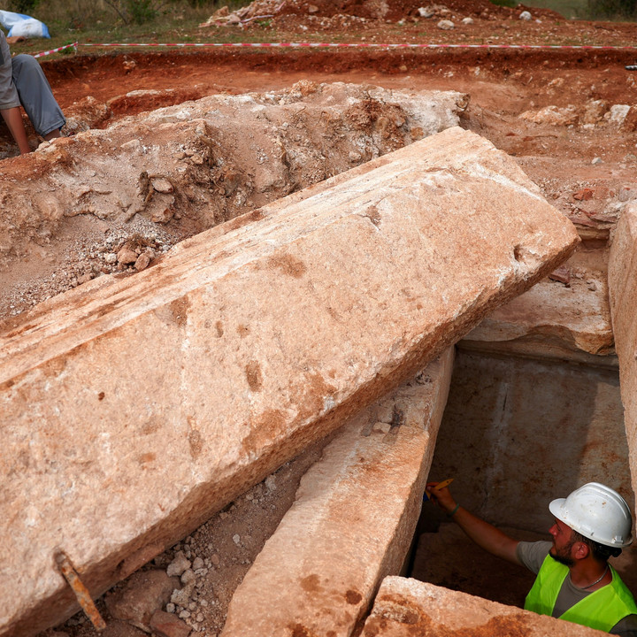 Makam ini pertama kali ditemukan warga sekitar yang melihat beberapa batu unik di dataran tinggi dekat perbatasan dengan Makedonia Utara. Staf dari Institut Arkeologi kemudian menggali pada awal Agustus dan menemukan struktur bawah tanah dengan lempengan batu kapur besar yang bertuliskan huruf Yunani.