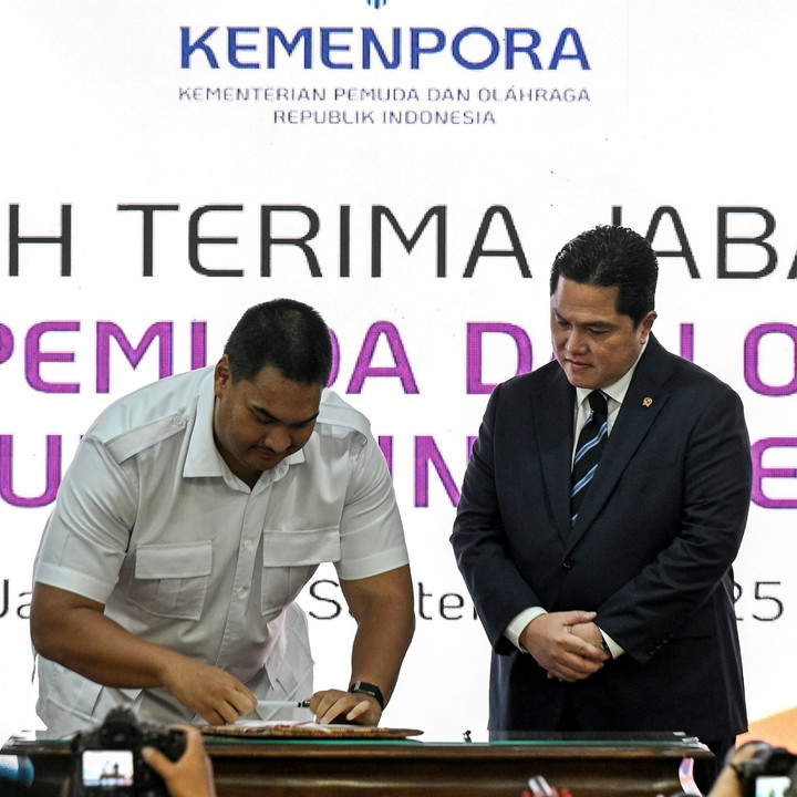 Menpora baru Erick Thohir dan pejabat lama Dito Ariotedjo melaksanakan serah terima jabatan (sertijab) di Kantor Kemenpora, Jakarta, Kamis (18/9). Sebelumnya, Erick resmi dilantik sebagai Menpora oleh Presiden Prabowo Subianto di Istana, Rabu (17/9).