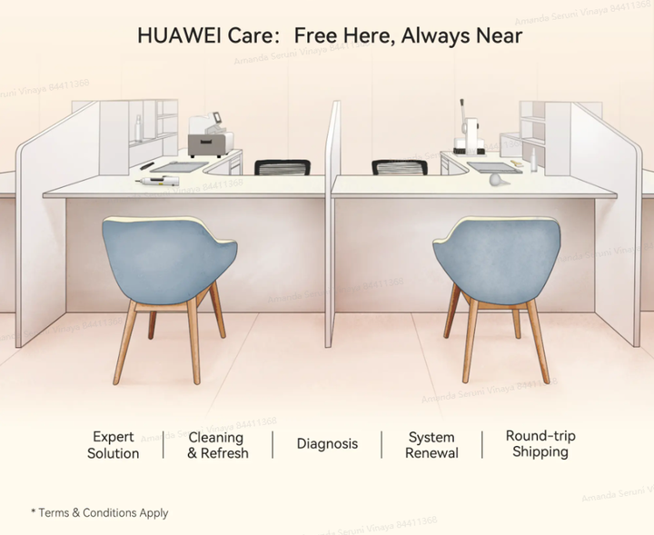 Untuk menjaga perangkat Huawei tetap higienis, Anda dapat memanfaatkan layanan pembersihan dan sterilisasi gratis yang akan membantu menghilangkan debu serta kuman yang dapat memengaruhi kinerja. Lalu ada layanan pembaruan sistem gratis untuk memastikan perangkat selalu aman, segar, dan bekerja lancar setiap saat.