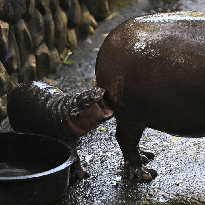 Moo Deng, kuda nil kerdil betina berusia dua bulan yang baru-baru ini menjadi sensasi viral di internet, mengikuti induknya, Jona di Kebun Binatang Terbuka Khao Kheow di provinsi Chonburi, Thailand MikumparanTRAVEL