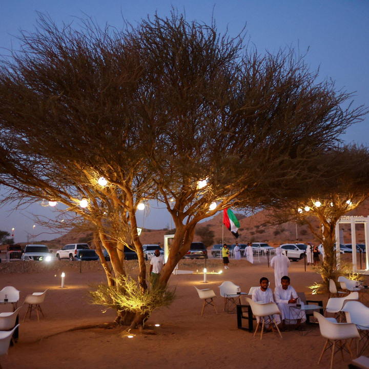 Sejumlah pengunjung berduyun-duyun ke kafe terbuka yang dibuka di jantung gurun saat musim dingin dimulai di perbatasan Dubai-Sharjah, UEA.kumparanTRAVEL
