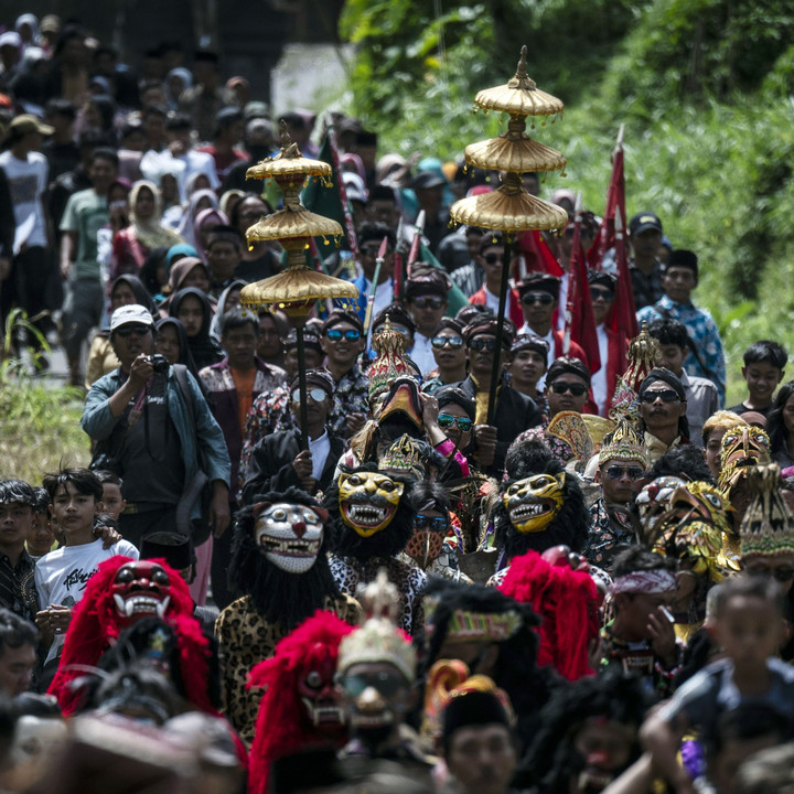 Sejumlah warga memakai berbagai kostum kesenian tradisional, saat mengikuti arak-arakan tradisi Sungkem Tlompak di kawasan lereng Gunung Merbabu, Dusun Gejayan, Banyusidi, Magelang, Jawa Tengah, Kamis (3/4/2025).