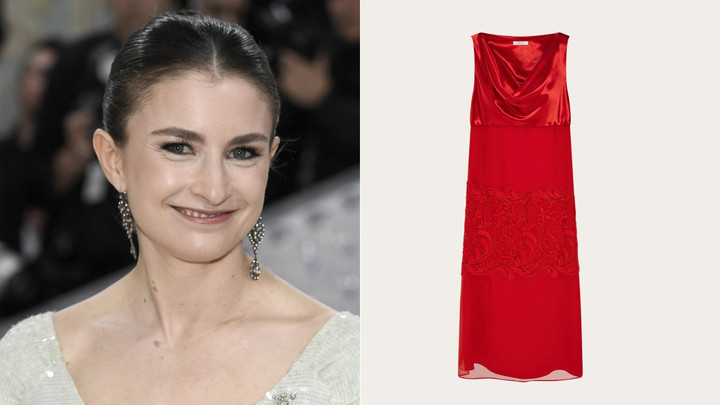 Gaun midi dari Ferragamo hadir dengan detail drapery berbahan satin dan silk-chiffon, dihiasi aksen renda yang memberi kesan glamor. Agar bisa membuat gaun satin ini tampak formal, bisa dipadukan dengan heels, clutch, dan blazer. Jika ingin lebih modern, blazer bisa diganti dengan jaket kulit.