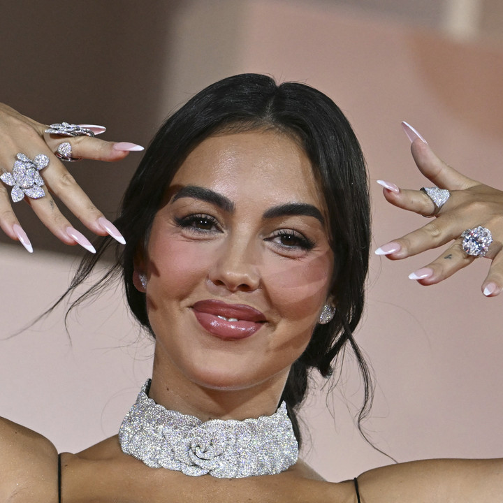 Di atas red carpet, Georgina memamerkan cincin tunangannya dengan Ronaldo yang dirumorkan memiliki berat hingga 30 carat. Ia memadukan cincin berliannya tersebut dengan deretan cincin besar berkilauan di tiga jari lainnya.