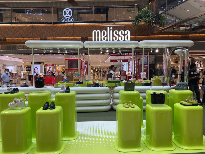 Pop-up ini dipenuhi dengan elemen geometris, warna-warna solid, dan detail glossy yang khas. Suasana futuristik dengan sentuhan retro ini memberikan pengalaman visual yang bold, playful, dan penuh warna, sambil memperkenalkan koleksi jelly shoes ikonik yang telah menjadi simbol Melissa.