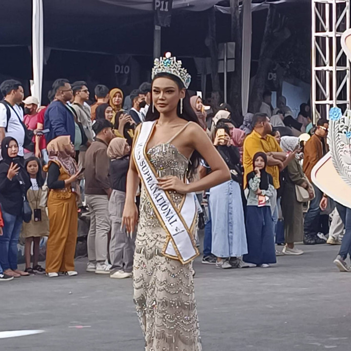 Dalam kesempatan ini, Harashta Haifa Zahra mengenakan gaun berdetail embellishment perak yang pas badan. Ia melengkapi gayanya dengan mahkota dan selempang Miss Supranational 2024. Di runway, Harashta menaiki kereta besar berhiaskan mahkota raksasa.