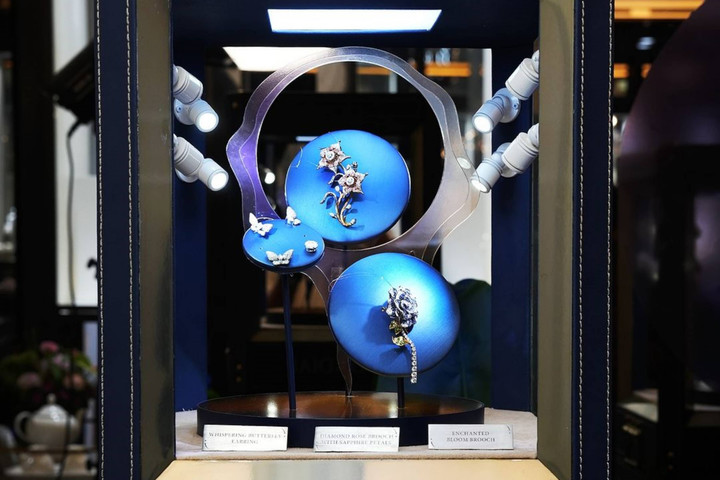 Setiap item perhiasan dibentuk dengan material campuran; bukan hanya menggunakan berlian, tetapi juga batu mulia lain seperti safir hingga mutiara besar mother of pearl.