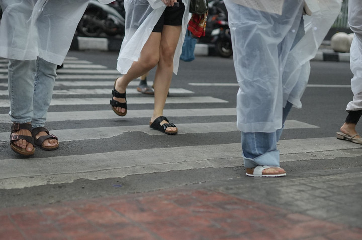 Kami dan rekan lainnya mengenakan jas hujan transparan dan tetap melangkah di bawah rintik hujan. Suasana ini justru menambah kesan seru sekaligus menjadi pembuktian bahwa sandal Birkenstock memiliki fitur anti-slip. kumparanWOMAN pun dapat berjalan dengan aman meski kondisi trotoar basah.